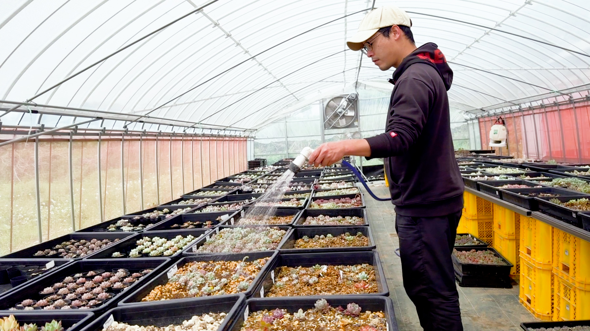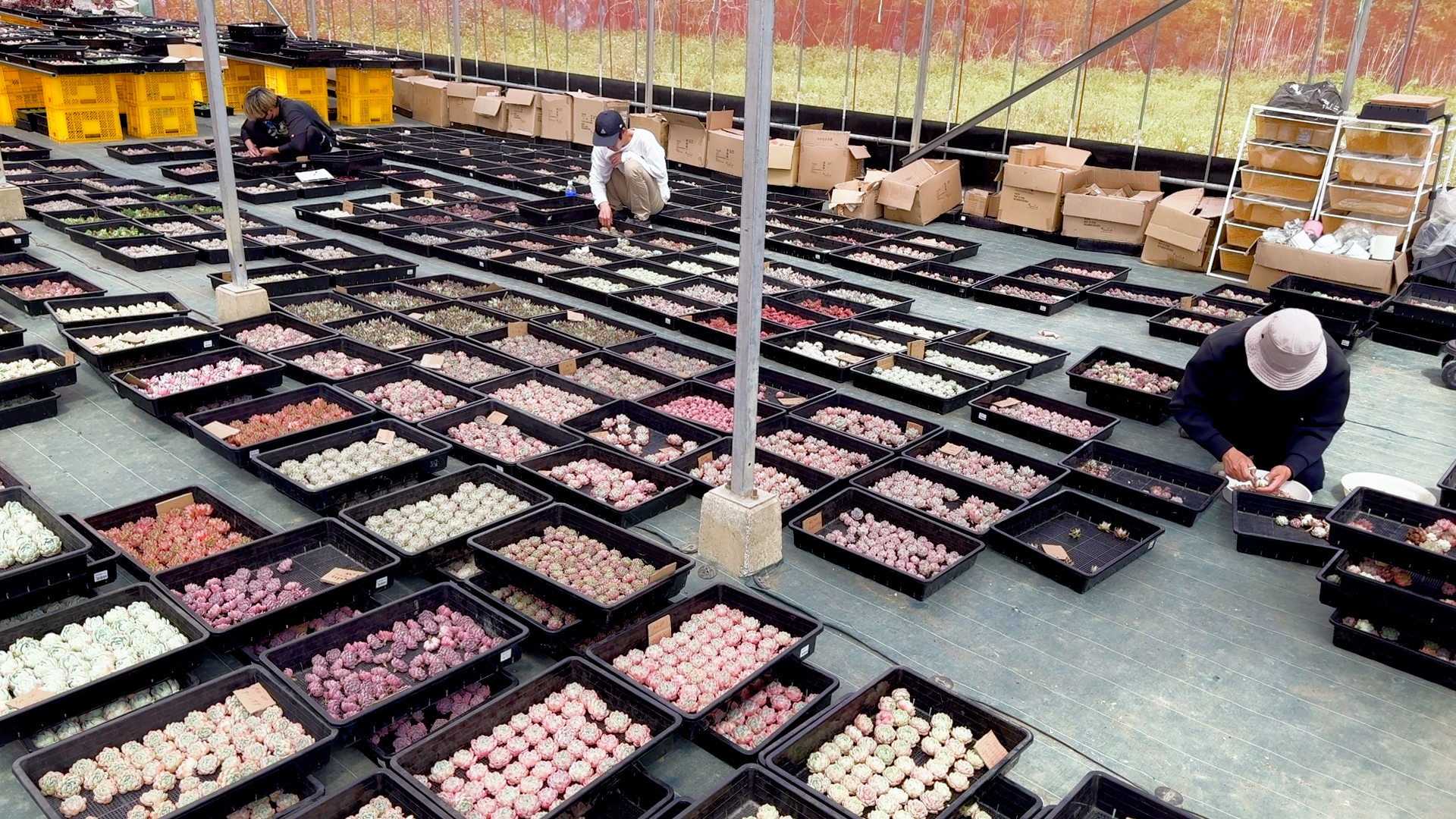 植物作業は事務所から車で5分のビニールハウスで作業